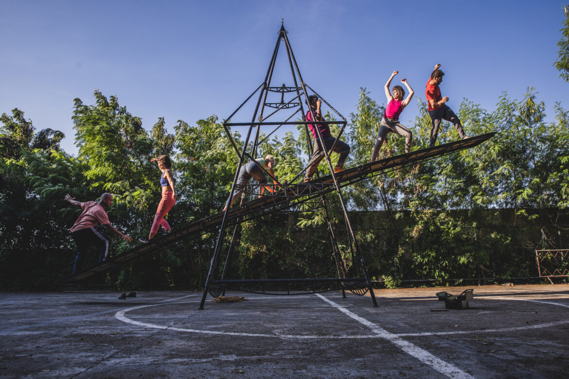 A proposta cênica mistura circo, dança e arquitetura em uma performance ao ar livre. Durante a apresentação, uma estrutura de ferro e madeira com cerca de 8 metros de altura é erguida ao vivo por seis artistas circenses e um músico. A montagem do cenário se transforma em coreografia e convida o público a refletir sobre o trabalho manual e coletivo na construção do picadeiro.