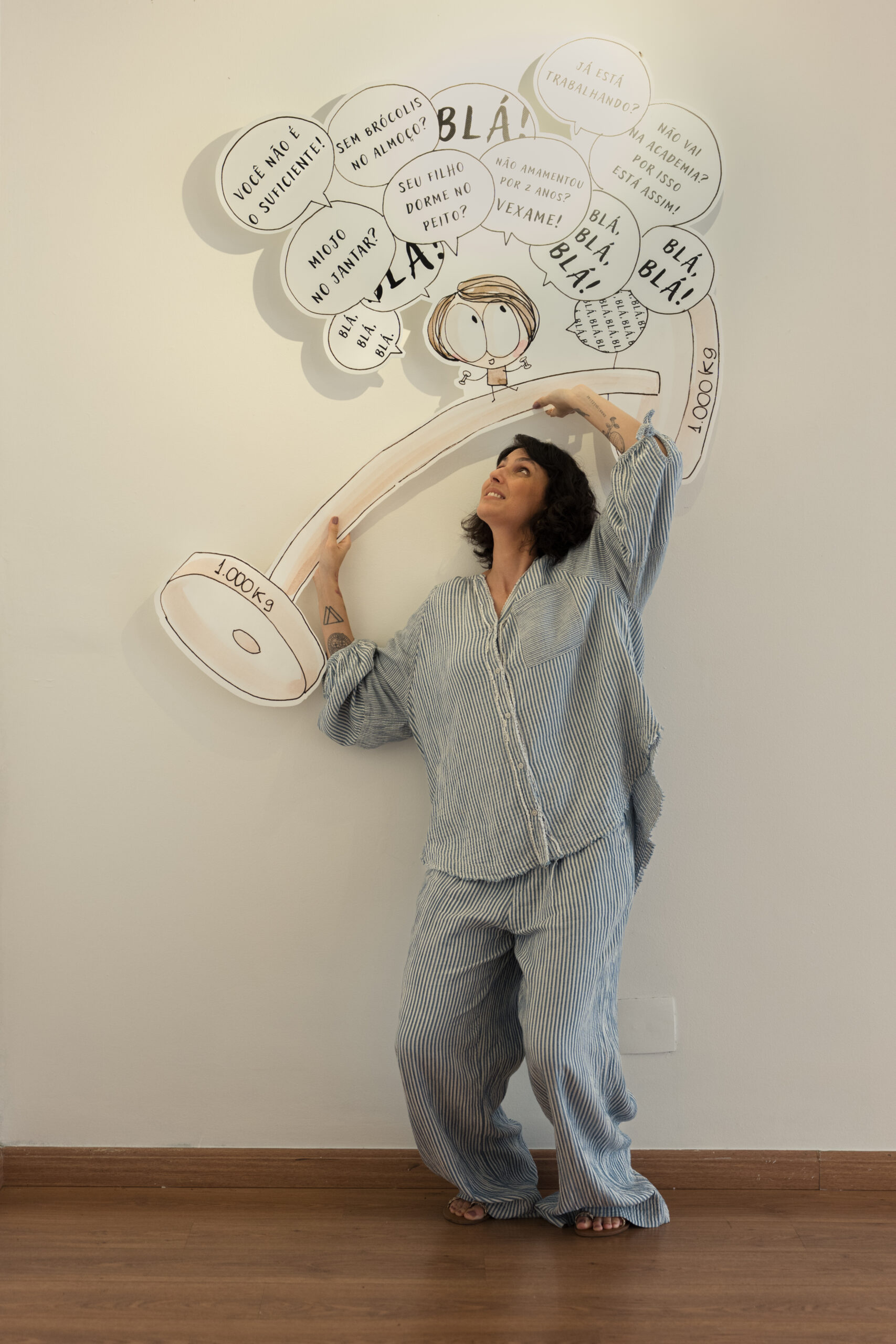 Lu Simão é pintora, ilustradora e escritora. Na exposição, a artista utiliza vivências relatadas por mulheres para transformar a culpa associada à maternidade em linguagem artística. O tema é tratado como elemento central das obras, que abordam a pressão social, as expectativas sobre o papel materno e a relação entre cuidado, exaustão e autocobrança.